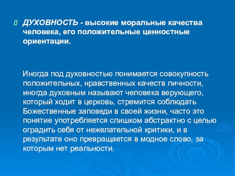 Иногда под духовностью понимается совокупность положительных, нравственных качеств личности, иногда духовным называют человека верующего, который ходит в церковь, стремится соблюдать Божественные заповеди в своей жизни, часто это понятие употребляется слишком абстрактно с целью оградить себя от нежелательной критики, и в результате оно превращается в модное слово, за которым нет реальности.