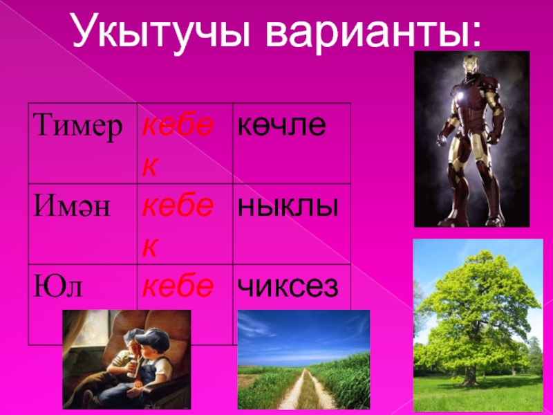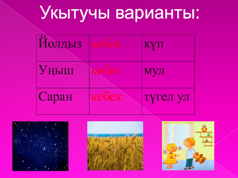 — Дусларым, тыңлагыз әле! — диде Чулпан. — Хезер мин сезгә бер табышмак әйтәм: