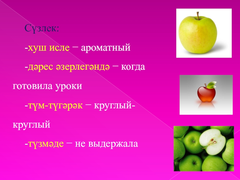 исле иде. Чулпанның алманы ашыйсы килде. Дәрес әзерләгәндә, Чулпан гел алмага карап утырды. Менә ул түзмәде, дуслары янына мәктәпкә китте.
