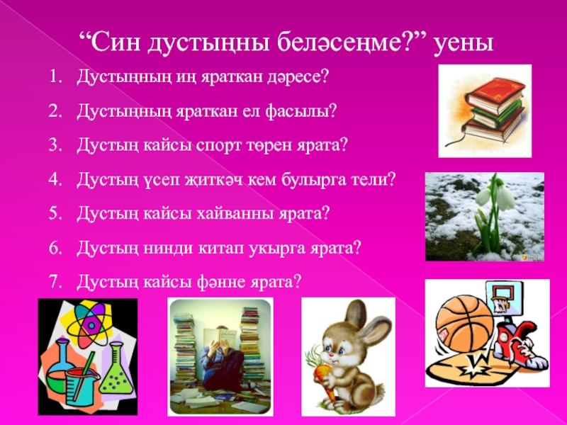 Слайд 11“Син дустыңны беләсеңме?” уены