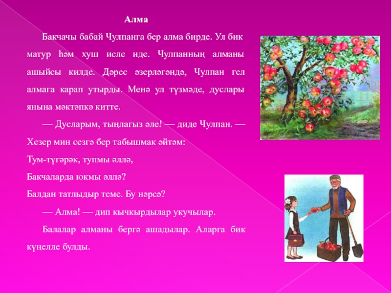 Бакчачы бабай Чулпанга бер алма бирде. Ул бик матур һәм хуш
