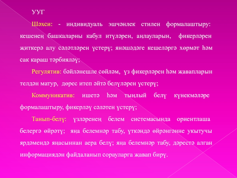 Шәхси: - индивидуаль эшчәнлек стилен формалаштыру: кешенең башкаларны кабул итүләрен, аңлауларын,