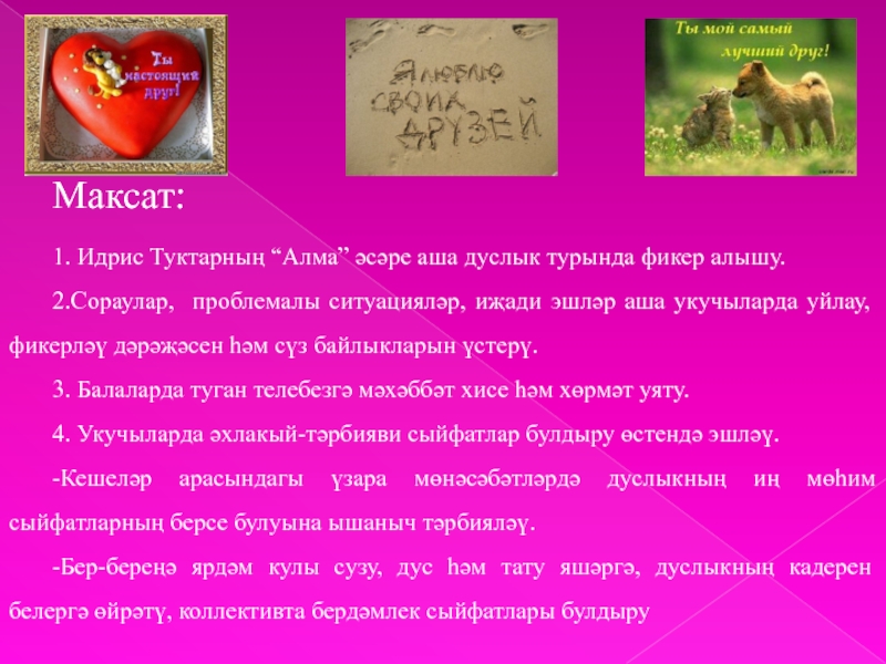 1. Идрис Туктарның “Алма” әсәре аша дуслык турында фикер алышу.