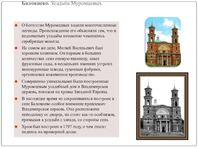 Совершенно уникальными были построенные Муромцевым усадебный дом и Владимирская церковь, похожая на храмы Западной Европы.