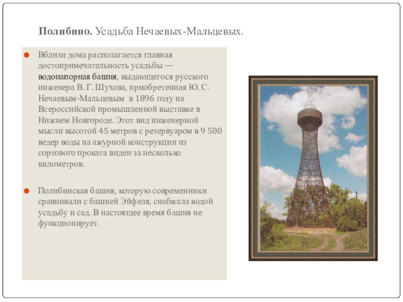 Слайд 7Вблизи дома располагается главная достопримечательность усадьбы — водонапорная башня, выдающегося русского