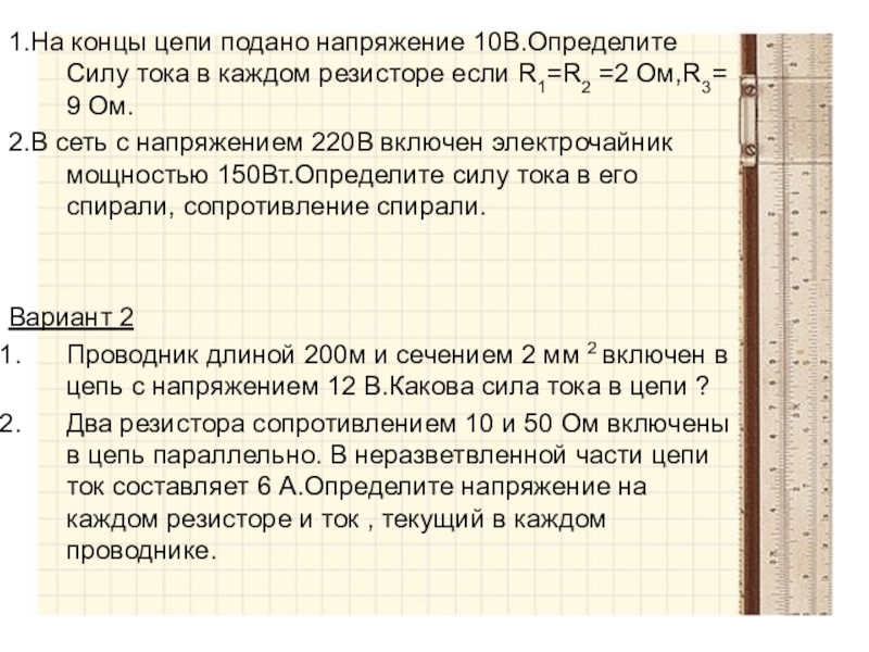 1.На концы цепи подано напряжение 10В.Определите Силу тока в каждом резисторе если R1=R2 =2 Ом,R3= 9 Ом.2.В сеть с напряжением 220В включен электрочайник мощностью 150Вт.Определите силу тока в его спирали, сопротивление спирали.Вариант 2Проводник длиной 200м и