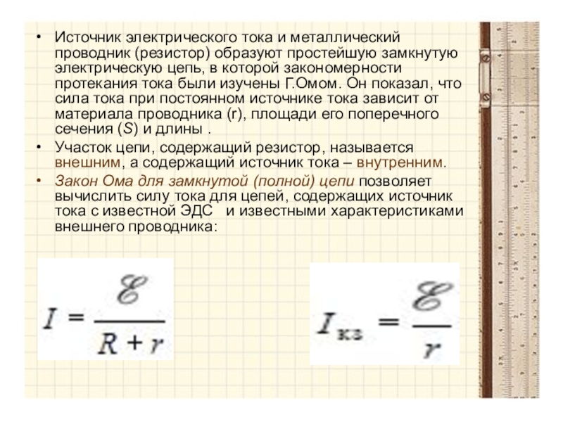 цепь, в которой закономерности протекания тока были изучены Г.Омом. Он показал, что сила тока при постоянном источнике тока зависит от материала проводника (r), площади его поперечного сечения (S) и длины .