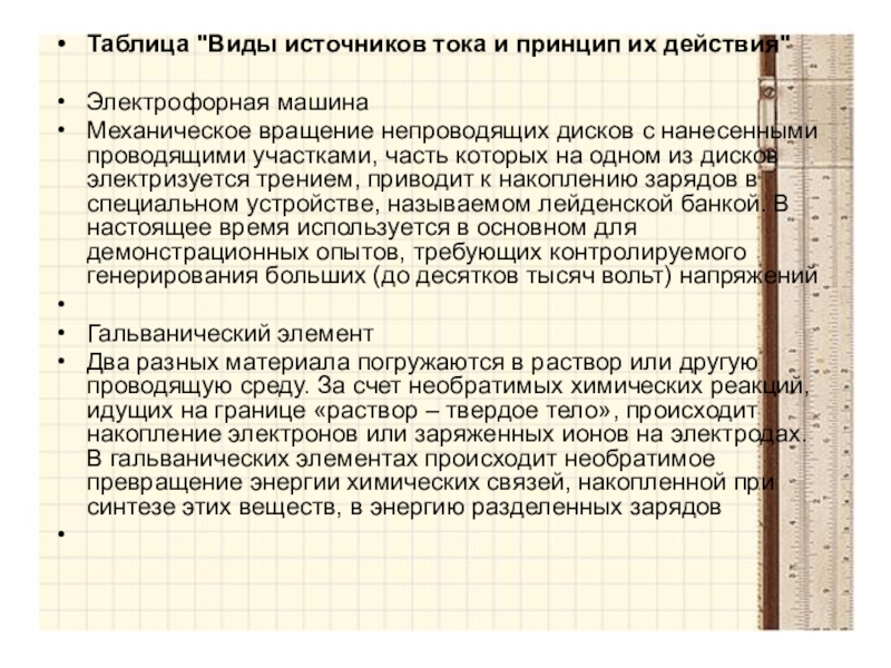 Слайд 6Таблица "Виды источников тока и принцип их действия"