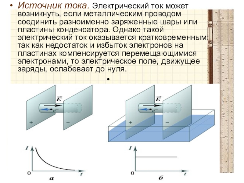 Источник тока. Электрический ток может возникнуть, если металлическим проводом соединить разноименно заряженные шары или пластины конденсатора. Однако