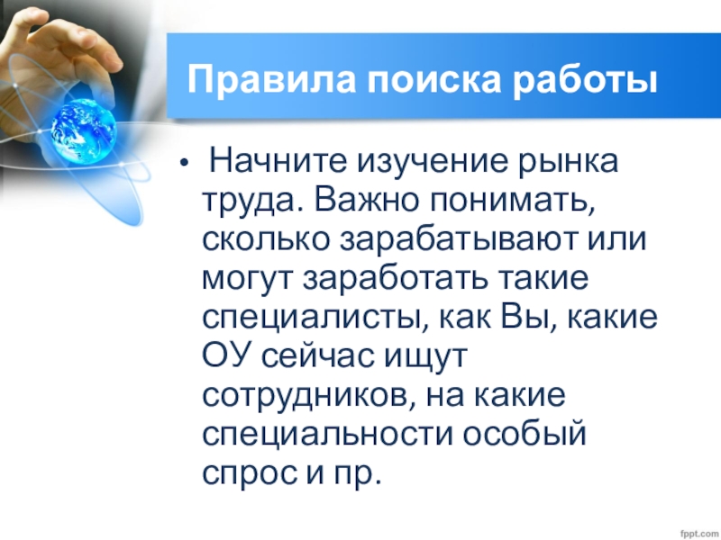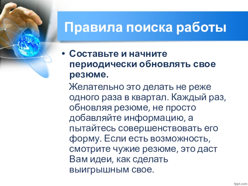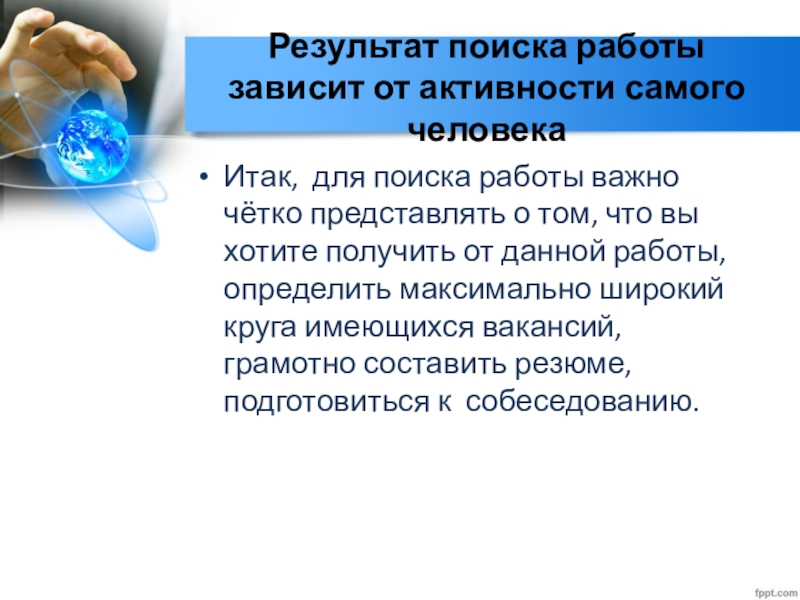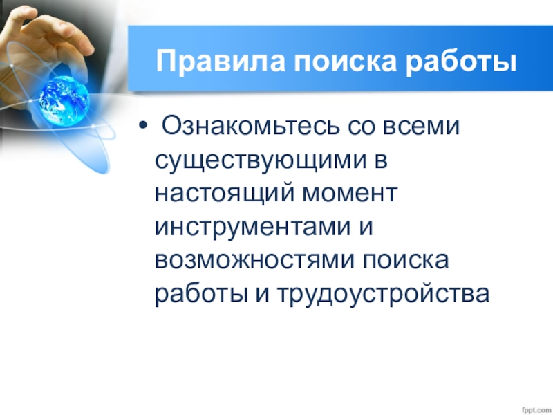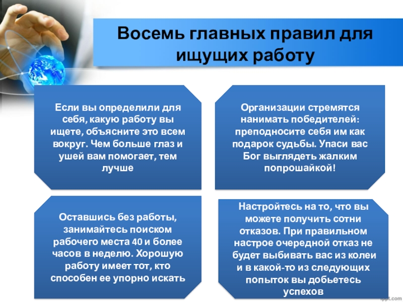 Оставшись без работы, занимайтесь поиском рабочего места 40 и более часов в неделю. Хорошую работу имеет тот, кто способен ее упорно искать