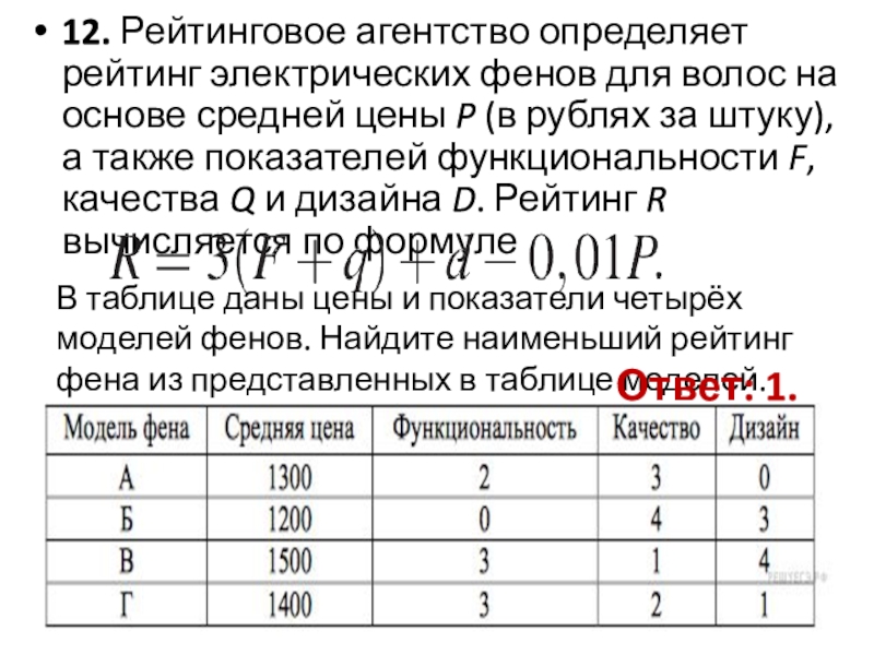 В таблице даны цены и показатели четырёх моделей фенов. Найдите наименьший рейтинг фена из представленных в таблице моделей.