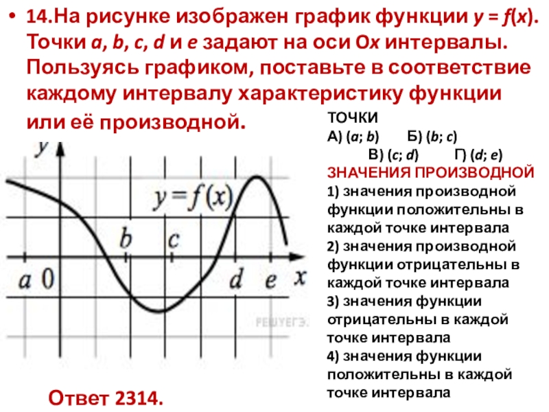 14.На рисунке изображен график функции y = f(x). Точки a, b, c, d и e задают на оси Ox интервалы. Пользуясь графиком, поставьте в соответствие каждому интервалу характеристику функции или её производной.