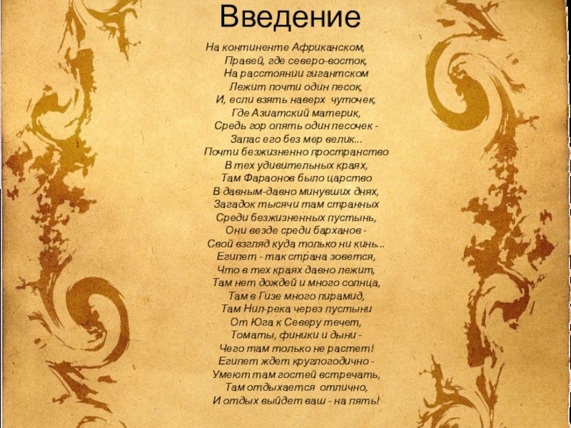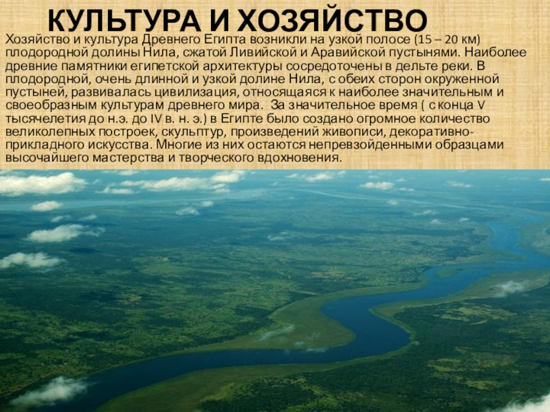 полосе (15 – 20 км) плодородной долины Нила, сжатой Ливийской и Аравийской пустынями. Наиболее древние памятники египетской архитектуры сосредоточены в дельте реки. В плодородной, очень длинной и узкой долине Нила, с обеих сторон окруженной пустыней, развивалась цивилизация, относящаяся к наиболее значительным и своеобразным культурам древнего мира. За значительное время ( с конца V тысячелетия до н.э. до IV в. н. э.) в Египте было создано огромное количество великолепных построек, скульптур, произведений живописи, декоративно-прикладного искусства. Многие из них остаются непревзойденными образцами высочайшего мастерства и творческого вдохновения.