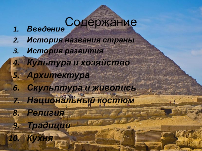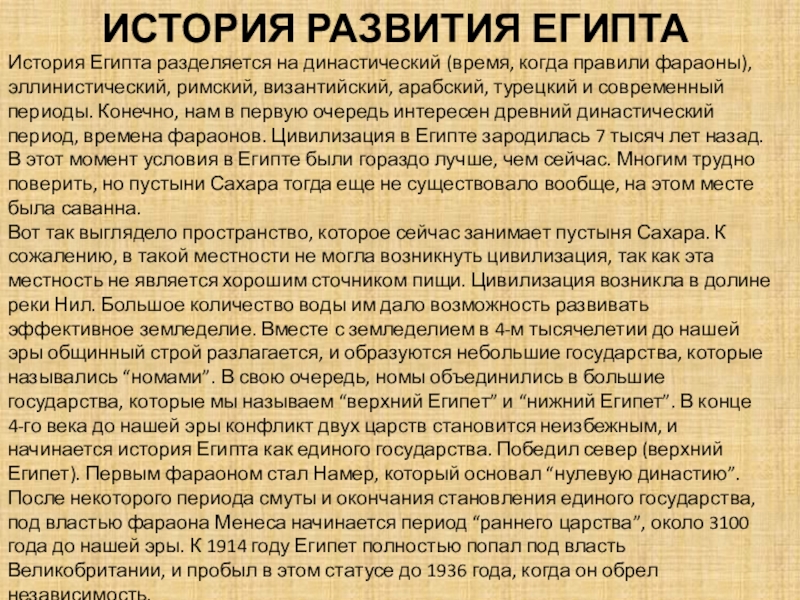 Вот так выглядело пространство, которое сейчас занимает пустыня Сахара. К сожалению, в такой местности не могла возникнуть цивилизация, так как эта местность не является хорошим сточником пищи. Цивилизация возникла в долине реки Нил. Большое количество воды им дало возможность развивать эффективное земледелие. Вместе с земледелием в 4-м тысячелетии до нашей эры общинный строй разлагается, и образуются небольшие государства, которые назывались “номами”. В свою очередь, номы объединились в большие государства, которые мы называем “верхний Египет” и “нижний Египет”. В конце 4-го века до нашей эры конфликт двух царств становится неизбежным, и начинается история Египта как единого государства. Победил север (верхний Египет). Первым фараоном стал Намер, который основал “нулевую династию”. После некоторого периода смуты и окончания становления единого государства, под властью фараона Менеса начинается период “раннего царства”, около 3100 года до нашей эры. К 1914 году Египет полностью попал под власть Великобритании, и пробыл в этом статусе до 1936 года, когда он обрел независимость.