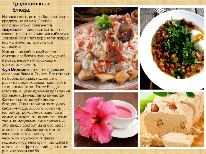 как история самой страны. Попробовав национальные блюда, вы лучше узнаете местные традиции и сможете проникнуться духом этой страны. Большинство блюд египетской кухни имеют острый вкус, так как для приготовления используют острые соусы и огромное количество разнообразных специй. Специи считаются своеобразным природным антисептиком, что в условиях жаркого климата — немаловажный фактор. На улицах египетских курортов большое количество ресторанов, кафе, закусочных, в которых можно найти блюда на любой вкус и кошелёк.