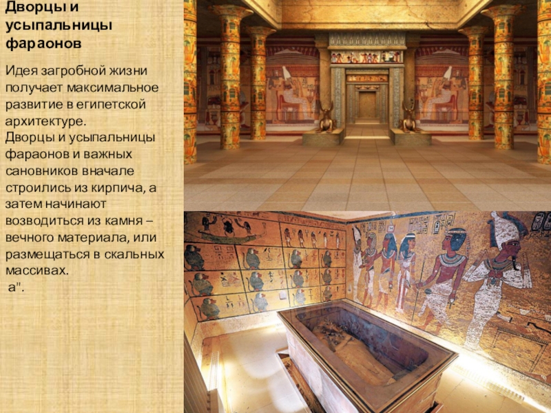Дворцы и усыпальницы фараонов и важных сановников вначале строились из кирпича, а затем начинают возводиться из камня – вечного материала, или размещаться в скальных массивах.