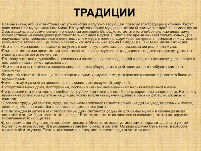 Все мы знаем, что Египет страна мусульманская и глубоко верующая, поэтому все традиции и обычаи берут свое начало из мусульманского мира. Не пугайтесь звуков муэдзина, который призывают арабов на молитву по 2 раза в день, а во время священного месяца рамадана Вы редко встретите кого-либо на улице днем, даже государственные учреждения работают только 2 часа в сутки. Египет в это время оживает только ночью. Для верующих ночь превращается в день, ведь днем мусульмане придерживаются поста, а принимать пищу можно лишь после захода солнца. Можно сказать, что вся жизнь во время Рамадана в Египте на месяц замирает.