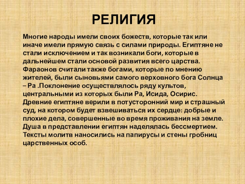 Многие народы имели своих божеств, которые так или иначе имели прямую связь с силами природы. Египтяне не стали исключением и так возникали боги, которые в дальнейшем стали основой развития всего царства. Фараонов считали также богами, которые по мнению жителей, были сыновьями самого верховного бога Солнца – Ра .Поклонение осуществлялось ряду культов, центральными из которых были Ра, Исида, Осирис. Древние египтяне верили в потусторонний мир и страшный суд, на котором будет взвешиваться их сердце: добрые и плохие дела, совершенные во время проживания на земле. Душа в представлении египтян наделялась бессмертием. Тексты молитв наносились на папирусы и стены гробниц царственных особ.
