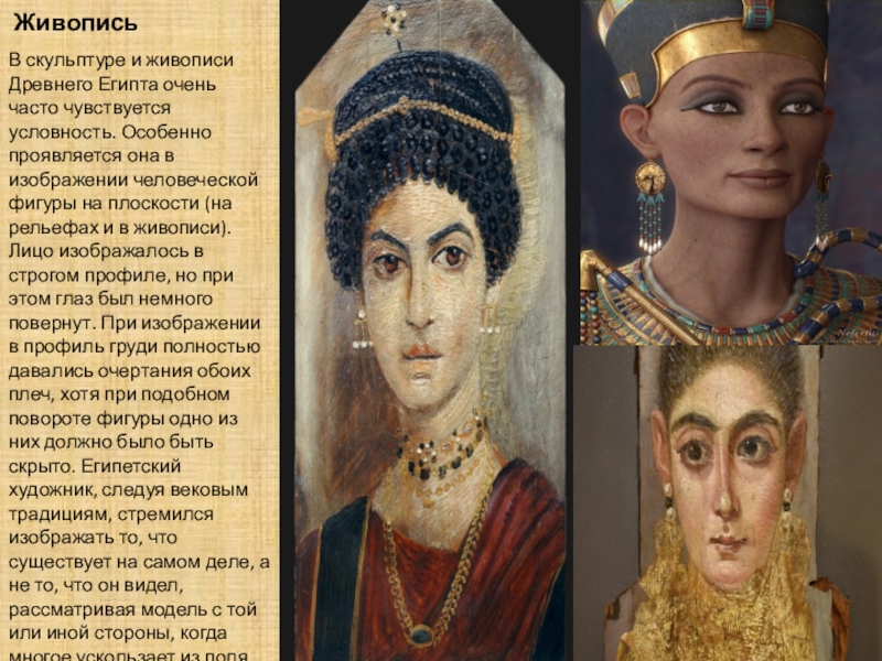 Особенно проявляется она в изображении человеческой фигуры на плоскости (на рельефах и в живописи). Лицо изображалось в строгом профиле, но при этом глаз был немного повернут. При изображении в профиль груди полностью давались очертания обоих плеч, хотя при подобном повороте фигуры одно из них должно было быть скрыто. Египетский художник, следуя вековым традициям, стремился изображать то, что существует на самом деле, а не то, что он видел, рассматривая модель с той или иной стороны, когда многое ускользает из поля зрения.