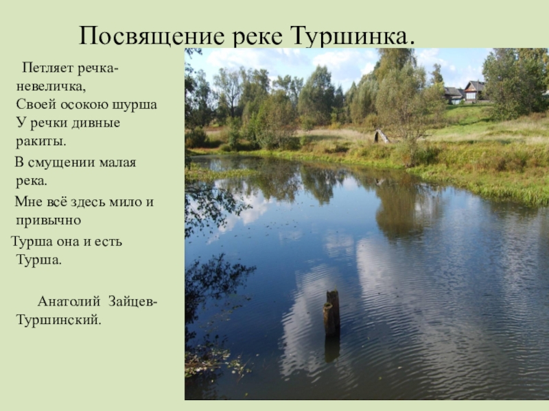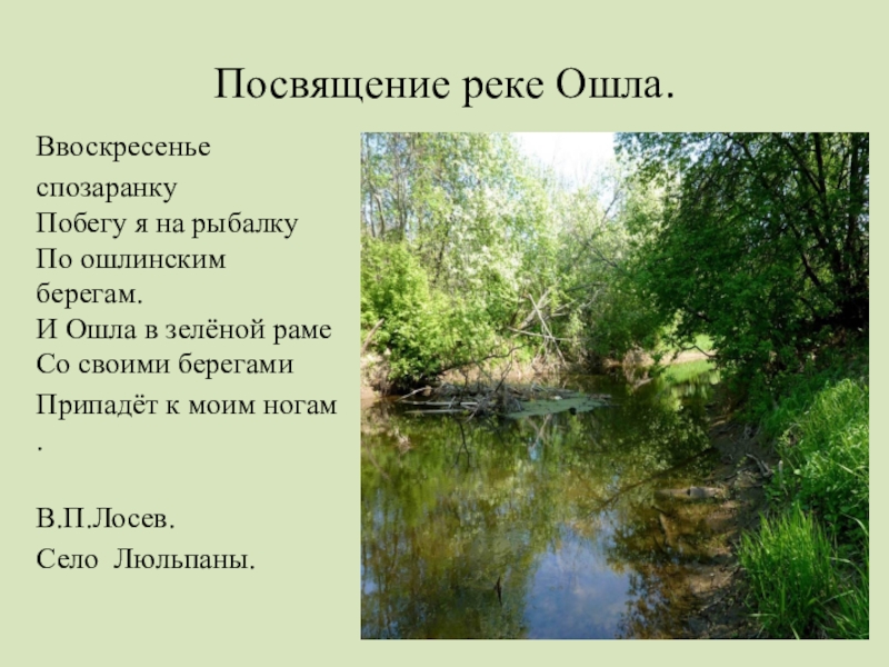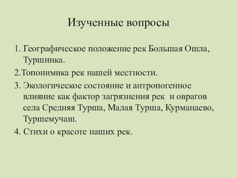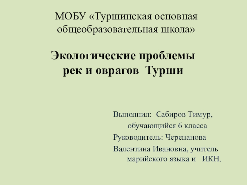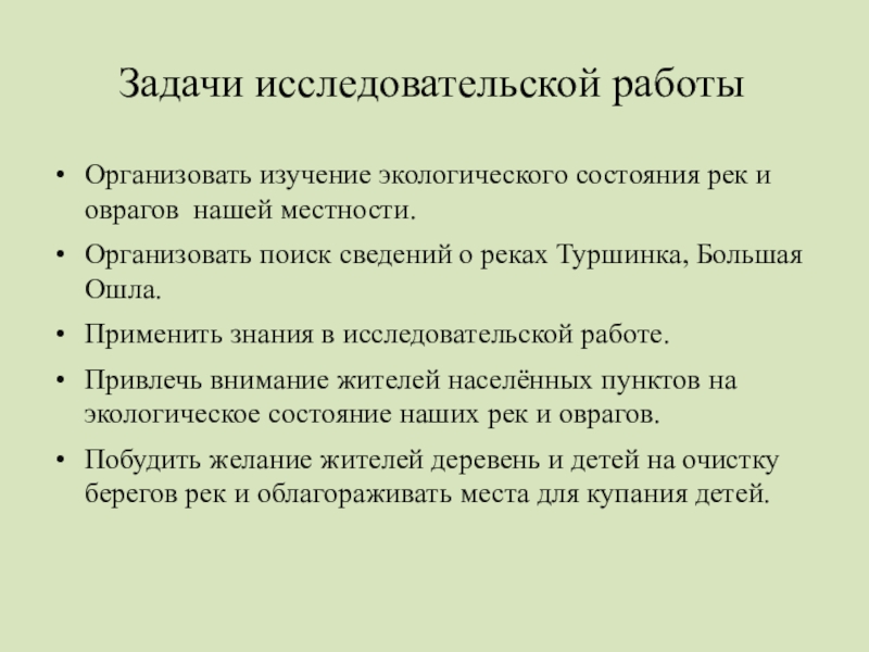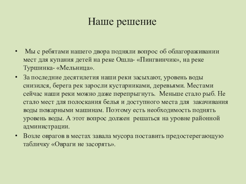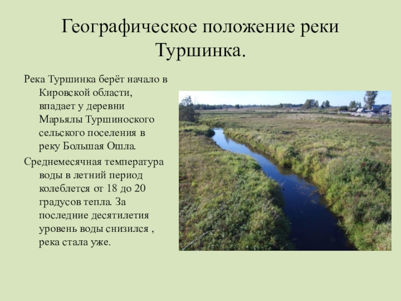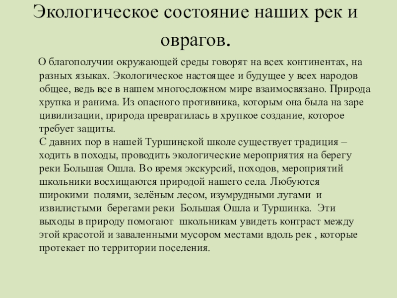морей, грунтовых вод) и оврагов является наиболее актуальной, так как всем известно - выражение «вода - это жизнь». Для нас Туршинка и Большая Ошла - это не просто реки нашей местности, но и родина. Поэтому меня особенно заинтересовала их экологическая проблема. А проблема назрела уже давно и требует немедленного разрешения. Мы надеемся, что люди изменят своё отношение к нашему достоянию - природе, ресурсы которой, увы, не безграничны.