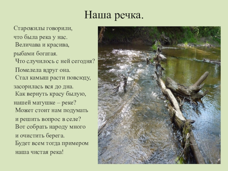 Привлечь внимание жителей населённых пунктов на экологическое состояние наших рек и оврагов.