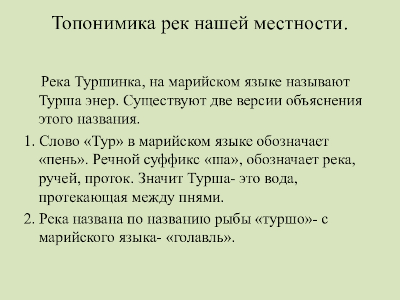2. Река названа по названию рыбы «туршо»- с марийского языка- «голавль».