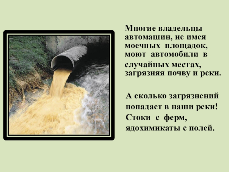 Слайд 14А сколько загрязнений попадает в наши реки! Стоки с ферм, ядохимикаты
