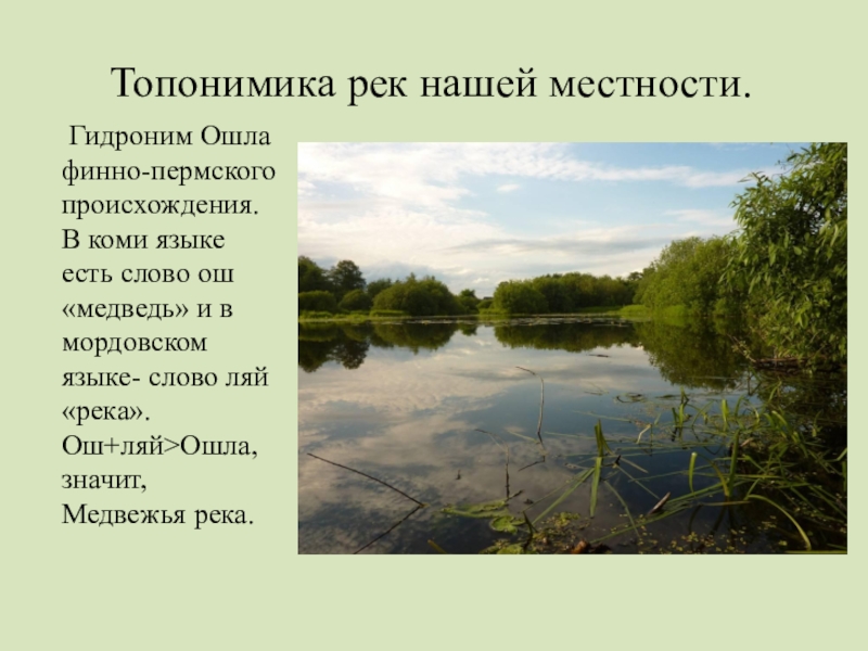 коми языке есть слово ош «медведь» и в мордовском языке- слово ляй «река». Ош+ляй>Ошла, значит, Медвежья река.