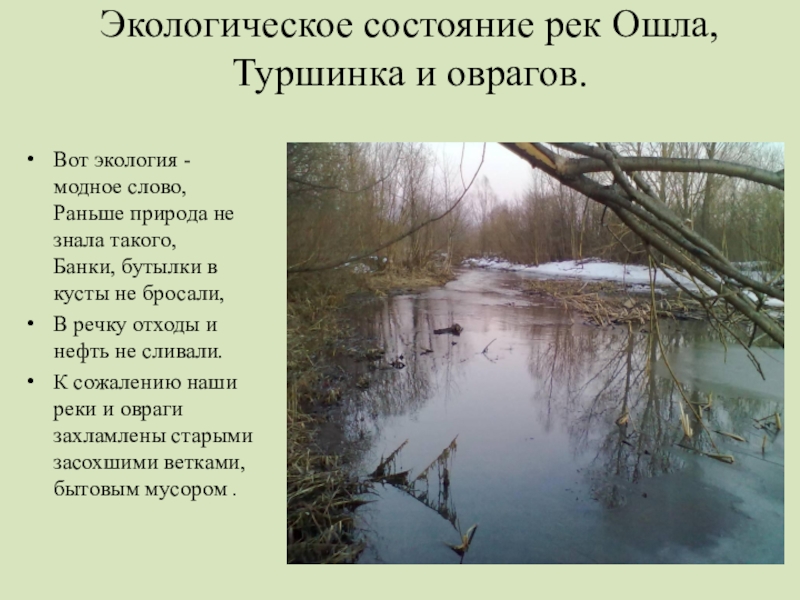 Экологическое состояние рек Ошла, Туршинка и оврагов.
