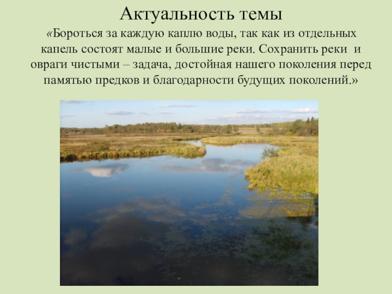 капель состоят малые и большие реки. Сохранить реки и овраги чистыми – задача, достойная нашего поколения перед памятью предков и благодарности будущих поколений.»