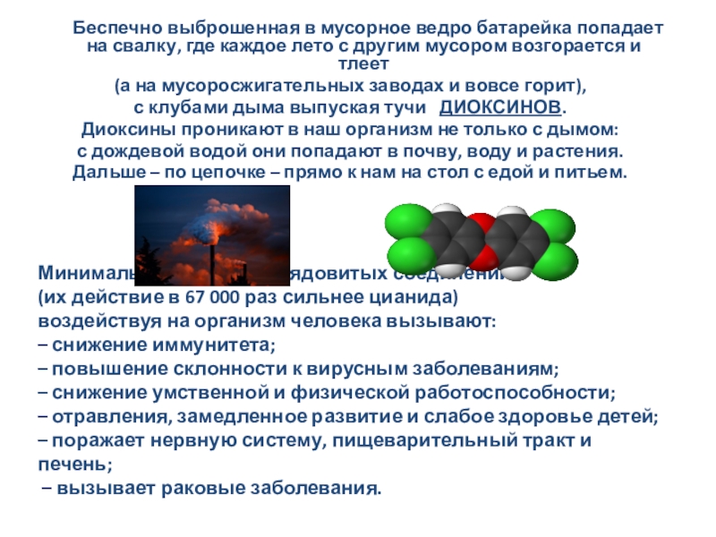 Беспечно выброшенная в мусорное ведро батарейка попадает на свалку, где каждое лето с другим мусором возгорается и тлеет