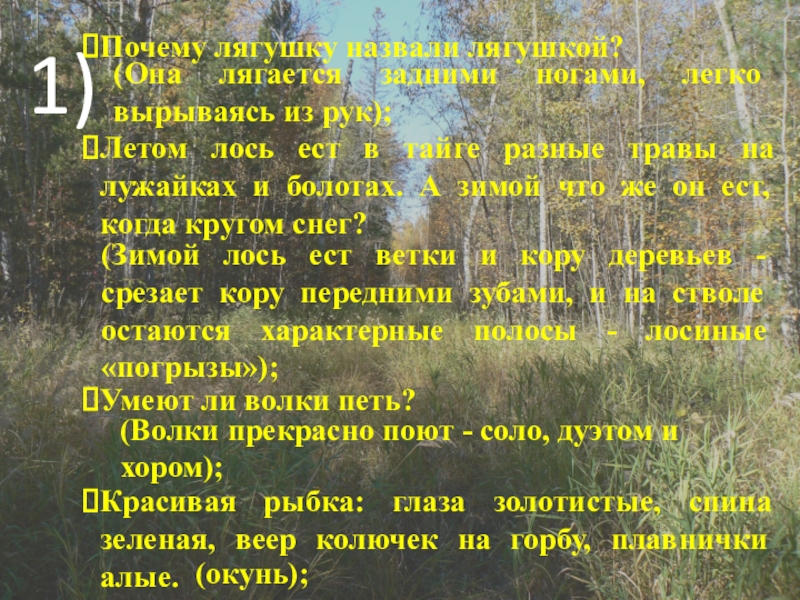 (Зимой лось ест ветки и кору деревьев - срезает кору передними зубами, и на стволе остаются характерные полосы - лосиные «погрызы»);