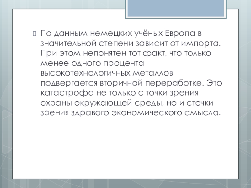 При этом непонятен тот факт, что только менее одного процента высокотехнологичных металлов подвергается вторичной переработке. Это катастрофа не только с точки зрения охраны окружающей среды, но и сточки зрения здравого экономического смысла.