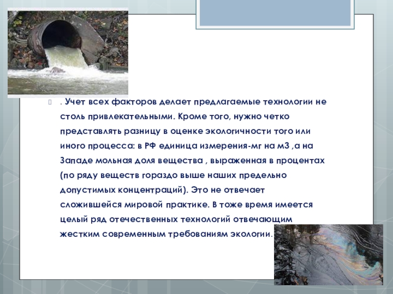 того, нужно четко представлять разницу в оценке экологичности того или иного процесса: в РФ единица измерения-мг на м3 ,а на Западе мольная доля вещества , выраженная в процентах (по ряду веществ гораздо выше наших предельно допустимых концентраций). Это не отвечает сложившейся мировой практике. В тоже время имеется целый ряд отечественных технологий отвечающим жестким современным требованиям экологии.