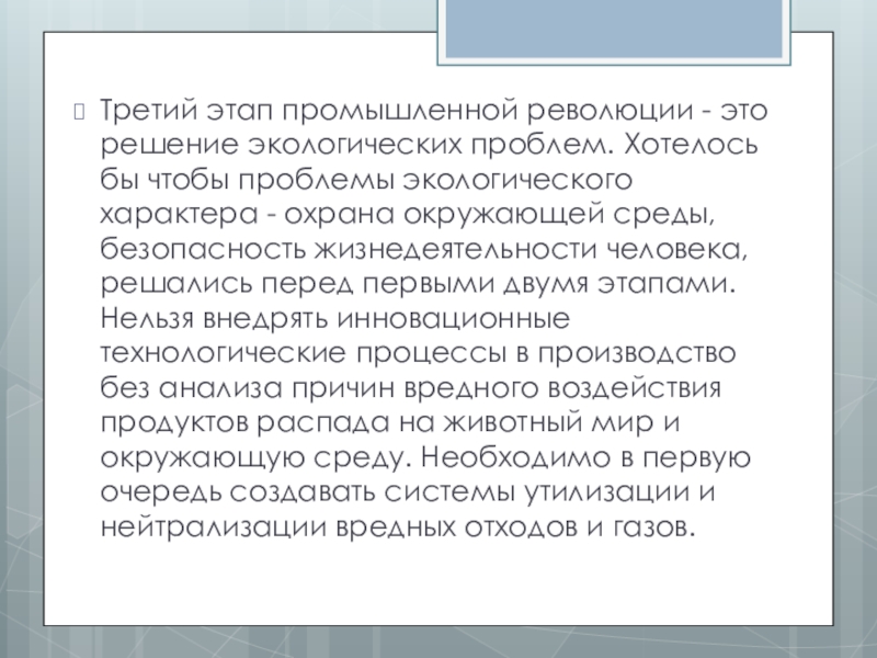Третий этап промышленной революции - это решение экологических проблем. Хотелось бы чтобы проблемы экологического характера - охрана