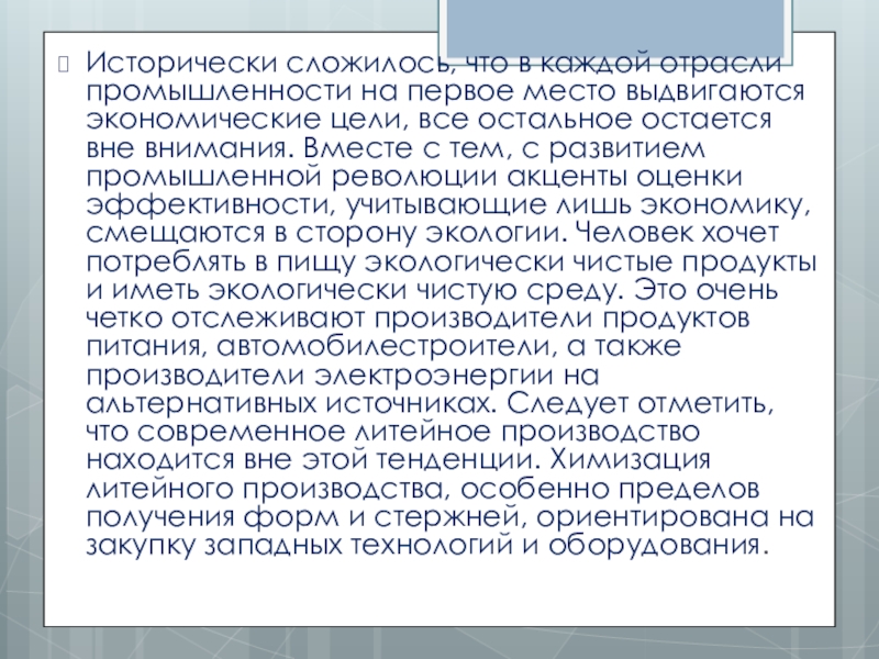 экономические цели, все остальное остается вне внимания. Вместе с тем, с развитием промышленной революции акценты оценки эффективности, учитывающие лишь экономику, смещаются в сторону экологии. Человек хочет потреблять в пищу экологически чистые продукты и иметь экологически чистую среду. Это очень четко отслеживают производители продуктов питания, автомобилестроители, а также производители электроэнергии на альтернативных источниках. Следует отметить, что современное литейное производство находится вне этой тенденции. Химизация литейного производства, особенно пределов получения форм и стержней, ориентирована на закупку западных технологий и оборудования.