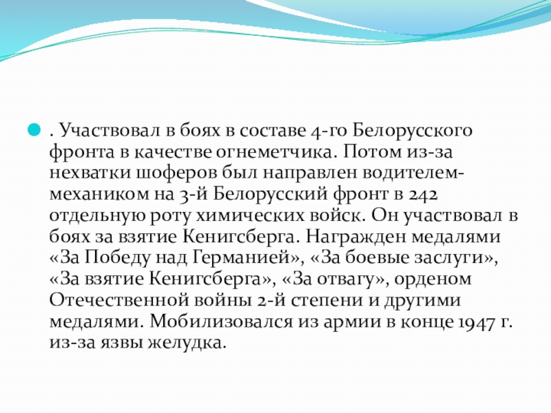 огнеметчика. Потом из-за нехватки шоферов был направлен водителем-механиком на 3-й Белорусский фронт в 242 отдельную роту химических войск. Он участвовал в боях за взятие Кенигсберга. Награжден медалями «За Победу над Германией», «За боевые заслуги», «За взятие Кенигсберга», «За отвагу», орденом Отечественной войны 2-й степени и другими медалями. Мобилизовался из армии в конце 1947 г. из-за язвы желудка.