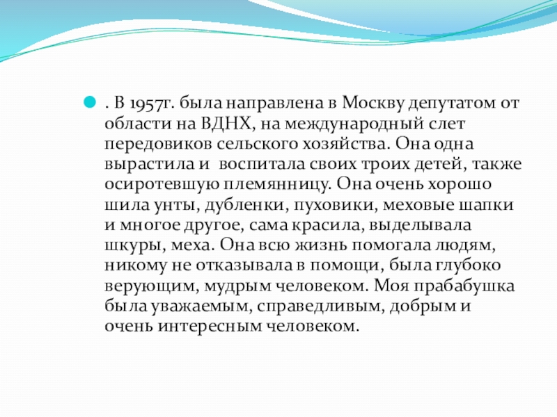 ВДНХ, на международный слет передовиков сельского хозяйства. Она одна вырастила и воспитала своих троих детей, также осиротевшую племянницу. Она очень хорошо шила унты, дубленки, пуховики, меховые шапки и многое другое, сама красила, выделывала шкуры, меха. Она всю жизнь помогала людям, никому не отказывала в помощи, была глубоко верующим, мудрым человеком. Моя прабабушка была уважаемым, справедливым, добрым и очень интересным человеком.