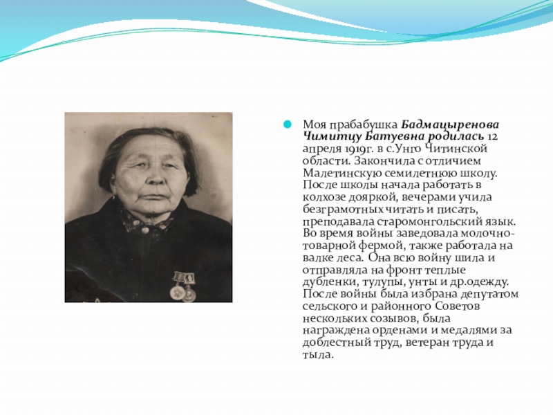 Слайд 8Моя прабабушка Бадмацыренова Чимитцу Батуевна родилась 12 апреля 1919г. в с.Унго