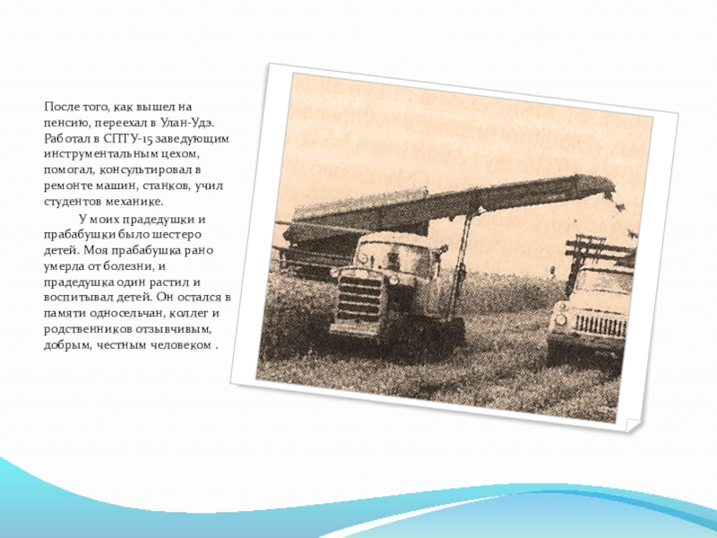 Слайд 7После того, как вышел на пенсию, переехал в Улан-Удэ. Работал в