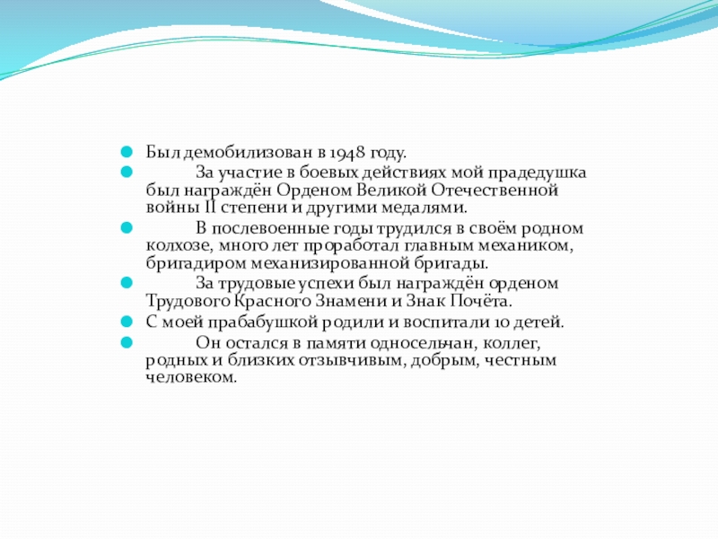 У моих прадедушки и прабабушки было шестеро детей. Моя прабабушка рано умерла от болезни, и прадедушка один растил и воспитывал детей. Он остался в памяти односельчан, коллег и родственников отзывчивым, добрым, честным человеком .