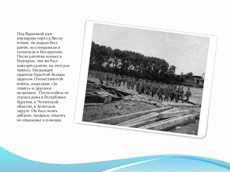 Слайд 11Под Варшавой при переправе через р.Вислу ночью, на лодках был ранен,