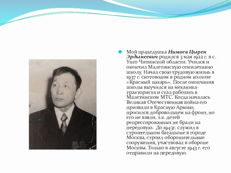 Слайд 4Мой прадедушка Нимаев Цырен Эрдынеевич родился 3 мая 1922 г. в