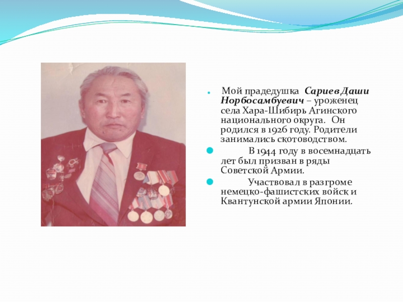 Слайд 2 Мой прадедушка Сариев Даши Норбосамбуевич – уроженец села Хара-Шибирь Агинского