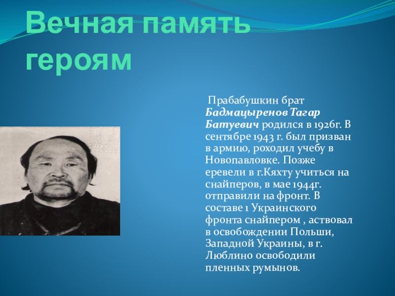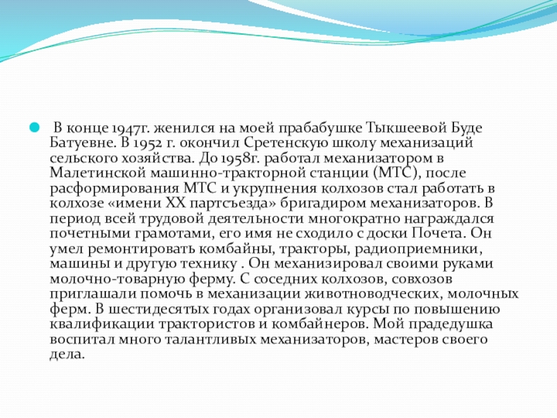 Слайд 6 В конце 1947г. женился на моей прабабушке Тыкшеевой Буде Батуевне.