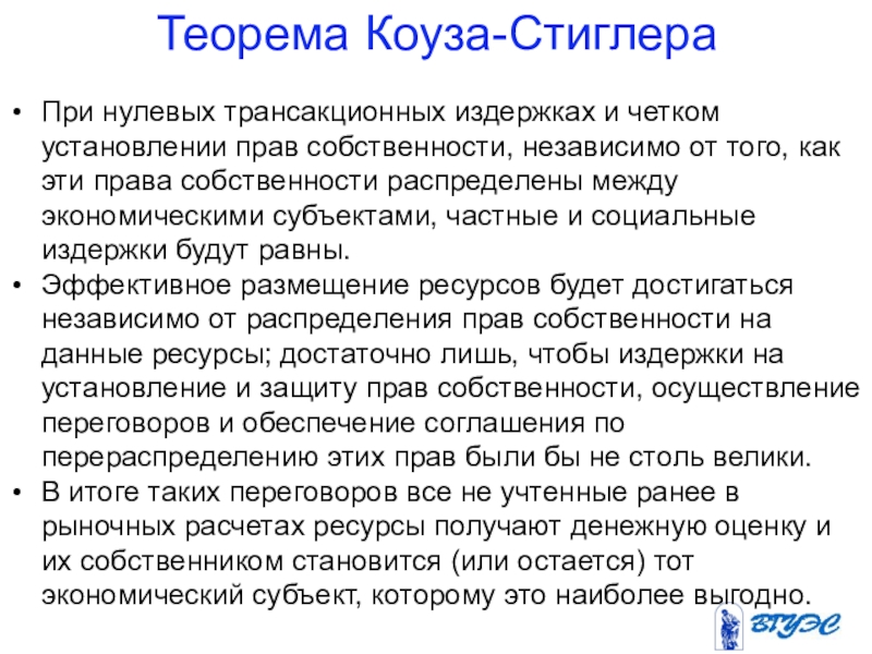 Эффективное размещение ресурсов будет достигаться независимо от распределения прав собственности на данные ресурсы; достаточно лишь, чтобы издержки на установление и защиту прав собственности, осуществление переговоров и обеспечение соглашения по перераспределению этих прав были бы не столь велики.