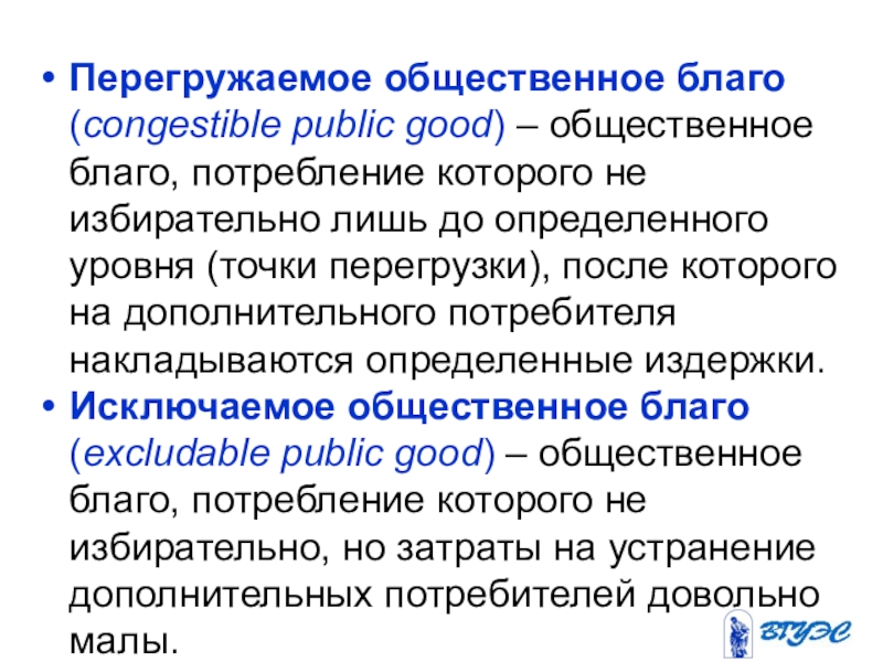 Слайд 47Перегружаемое общественное благо (congestible public good) – общественное благо, потребление которого