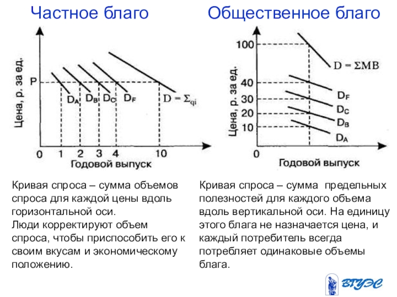 Кривая спроса – сумма предельных полезностей для каждого объема вдоль вертикальной оси. На единицу этого блага не назначается цена, и каждый потребитель всегда потребляет одинаковые объемы блага.