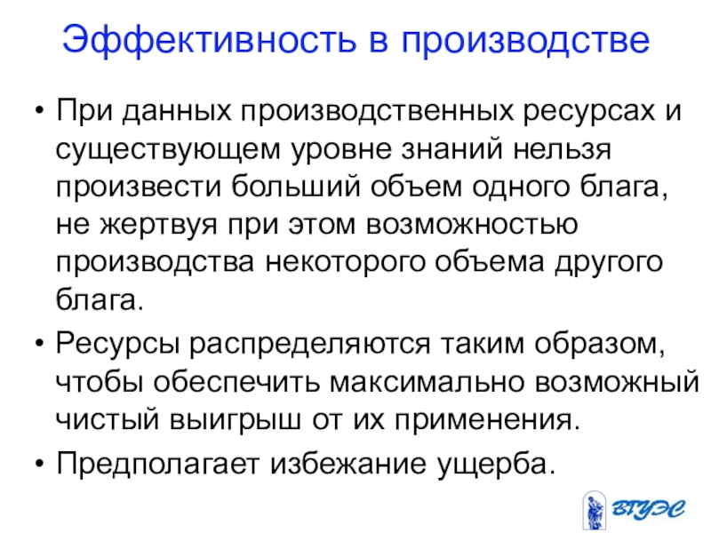 Ресурсы распределяются таким образом, чтобы обеспечить максимально возможный чистый выигрыш от их применения.