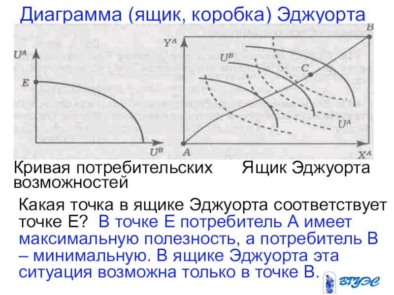 точке Е? В точке Е потребитель А имеет максимальную полезность, а потребитель В – минимальную. В ящике Эджуорта эта ситуация возможна только в точке В.